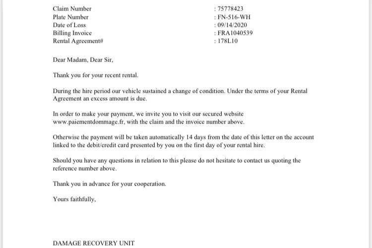 I called the Damage Recovery Unit, and after being on hold for over 10 minutes, spoke with a team member who then transferred me to the Customer Care department. I spoke with Shyleine (I apologize for mis-spelling her name). I explained the situation and that this was a damage on my rental agreement.