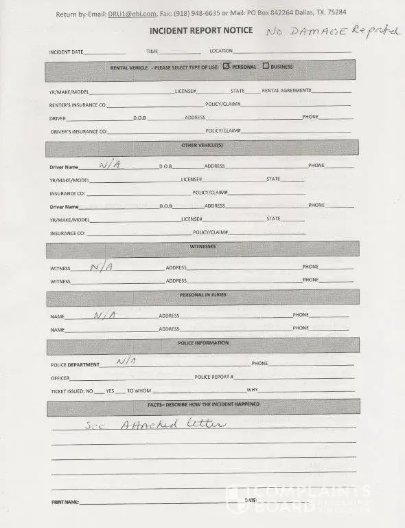 When departing the Enterprise car rental, we had requested a blank invoice to prove that we returned the car and that there was no out of pocket costs (Geico to cover all costs). The Enterprise Rep Christine mentioned that Geico did not pay them rental fee for 2 days and could not produce an invoice or proof of car return. I requested documentation in writing stating we returned the car with ¾ tank of fuel and there were no damages to the car. We had asked for the rental cars’ history to see if these damages have been reported prior to our rental. Christine did not provide any information, but John signed off on our contract that the car was returned “No extra damage”. Attached is a copy of this statement with John’s signature.