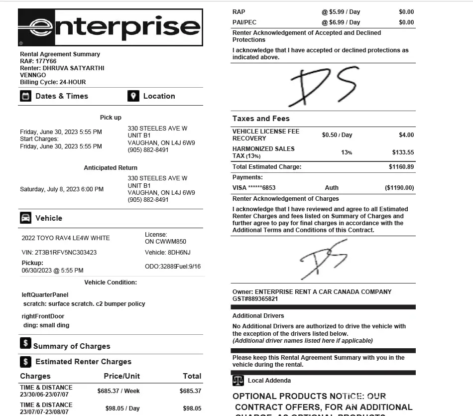 1- I rented out a car on 23rd June 2023 and returned on 26th June 2023.