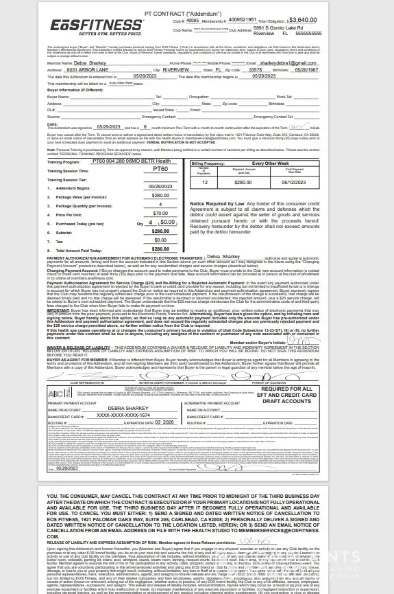 Hello, my name is Debra Sharkey of Riverview, Fl. I signed up for the EOS Gym in Riverview, Fl. When I signed up with James on 29 May 2023. I really felt as if this was a great relationship the way this was explained based on my needs. I was a long-distance endurance athlete, suffered injuries that had me sidelined for a few years and was ready to get back into the gym. EOS offers on their website post-injury rehab and anti-aging prehab, just what I needed pending another surgery on 28 Aug which was clearly stated and is noted in my PII file. Signed on the dotted line, charged on my credit card 6/12/23 $280x4 60 min sessions. What I got was bounced around to 4 different trainers. Then I had to travel for 1 week for work in June. Upon return, Andrew Reyes contacted me and stated he would be my trainer. We met on 28 June 23 and went over desired outcomes and restrictions. I explained we were not where I wanted to be because of not having gym training in June and that we would only have 8 workouts in July because I had to travel for work for 2 weeks in August, but would like an on-the-road plan.