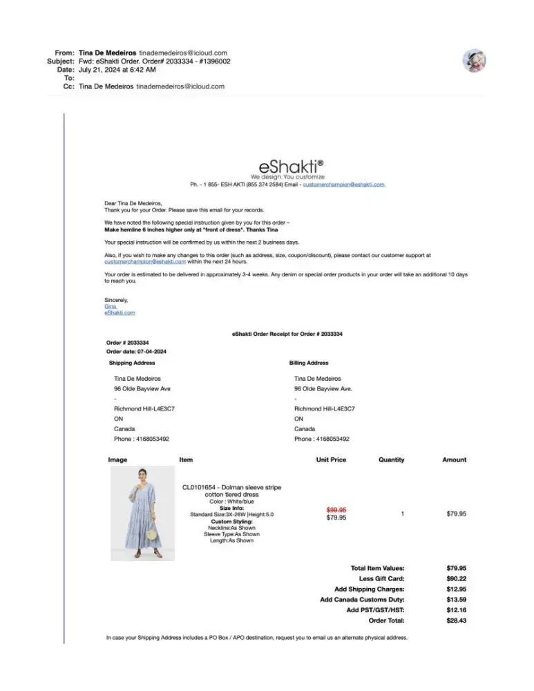 I loved the dresses I purchased from eShakti, until I got an email from DHL telling me that I owed import duties. Having already checked on the eShakti web site, I felt confident that this would not be an issue as eShakti say on their website that duties and taxes are already been paid. I am now being harassed by DHL for not paying and eShakti are not resolving the situation. Apparently, it is my responsibility. eShakti need to contact DHL to resolve this issue Reference: Customer Num: [protected] Invoice: AVI5759120