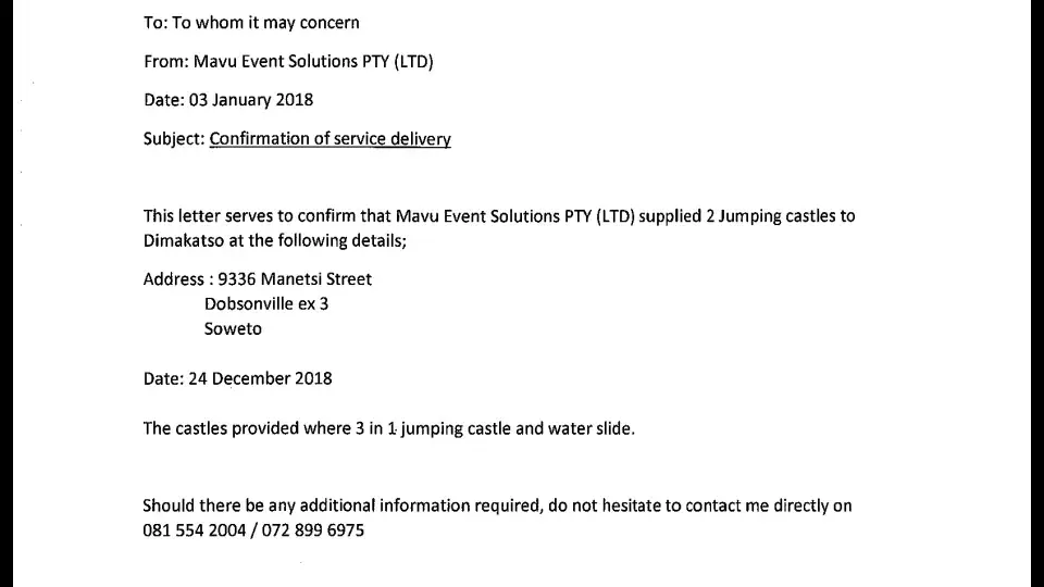 I refer to our recent tax invoice totalling an amount of R110 000, a copy of which is attached hereto.