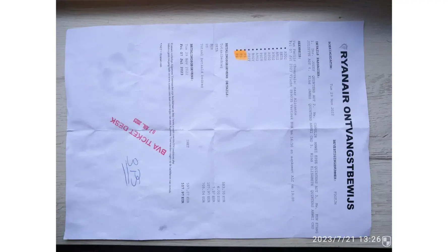 [protected] ) was executed by RYANAIR ( flight number: [protected]) on July 7 2023 from Beauvais ( Paris) (Flight FR9035 depart 16.50 h and arrival Alicante at 19.00 h).
