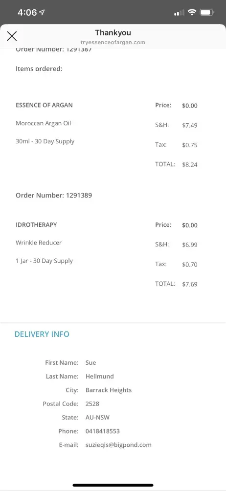 A few days later, the Fraud Squad for my credit card company called me to say they had identified some "unusual activity" on my VISA card, and it turned out not only was the proprietor of Essense of Argan creme ripping me off, but my credit card info had been sold to ANOTHER individual who maxxed out my card, buying multiple orders of high-end meal deliveries! The bank KNEW I was living on a $700 a month allowance, and that the purchases were WAY out of my ability to afford these kind of purchases, so they immediately cancelled my VISA card (which was a hardship on me when a few days later I was hospitalized, and had to pay for a prescription with a credit card, but no longer had a valid one, and the new card didn't arrived until 4 weeks later! By that time, I was in dreadful arrears in my utility bills, and I couldn't fill my eye med prescriptions, nor buy food. I eventually got a new VISA card, but here I am, 22 months later, and I've only JUST paid off all the debt I accumulated, NO THANKS to the ESSENSE OF ARGAN SCAM!