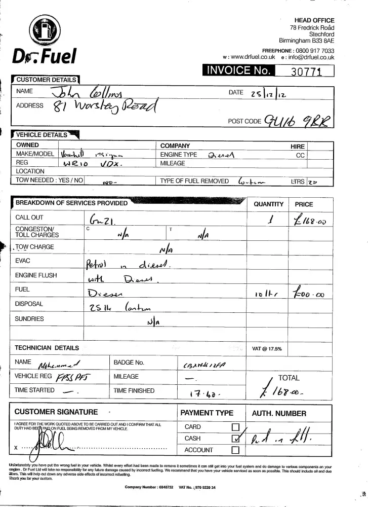 On my return to the station, I was served by a different assistant (Vimal Kanten) who was exceptionally helpful. He confirmed my purchase had been petrol and said that he would report the confusion to his manager. He also helped me contact a specialist agency to remove the petrol and replace it with diesel, a cost of £168. Largely as a result of his help I was able to drive my wife back home.