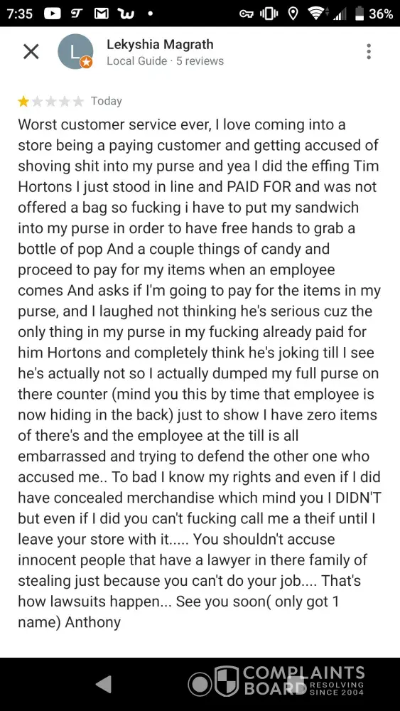 Worst customer service ever, I love coming into a store being a paying customer and getting accused of shoving [censored] into my purse and yea I did the effing tim hortons I just stood in line and paid for and was not offered a bag so [censored]ing I have to put my sandwich into my purse in order to have free hands to grab a bottle of pop and a couple things of candy and proceed to pay for my items when an employee comes and asks if i'm going to pay for the items in my purse, and I laughed not thinking he's serious cuz the only thing in my purse in my [censored]ing already paid for him hortons and completely think he's joking till I see he's actually not so I actually dumped my full purse on there counter (mind you this by time that employee is now hiding in the back) just to show I have zero items of there's and the employee at the till is all embarrassed and trying to defend the other one who accused me.. To bad I know my rights and even if I did have concealed merchandise which mind you I didn't but even if I did you can't [censored]ing call me a theif until I leave your store with it... You shouldn't accuse innocent people that have a lawyer in there family of stealing just because you can't do your job... That's how lawsuits happen... See you soon (only got 1 name) anthony