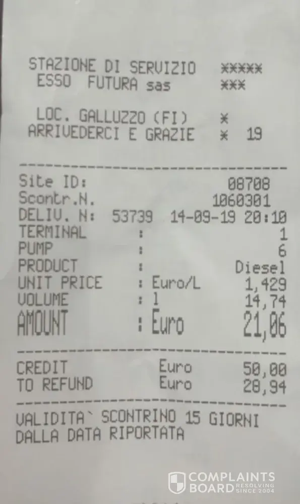 Me and my family put gas on esso station in italy florence on saturday, 14 september. The site Id is: 08708.