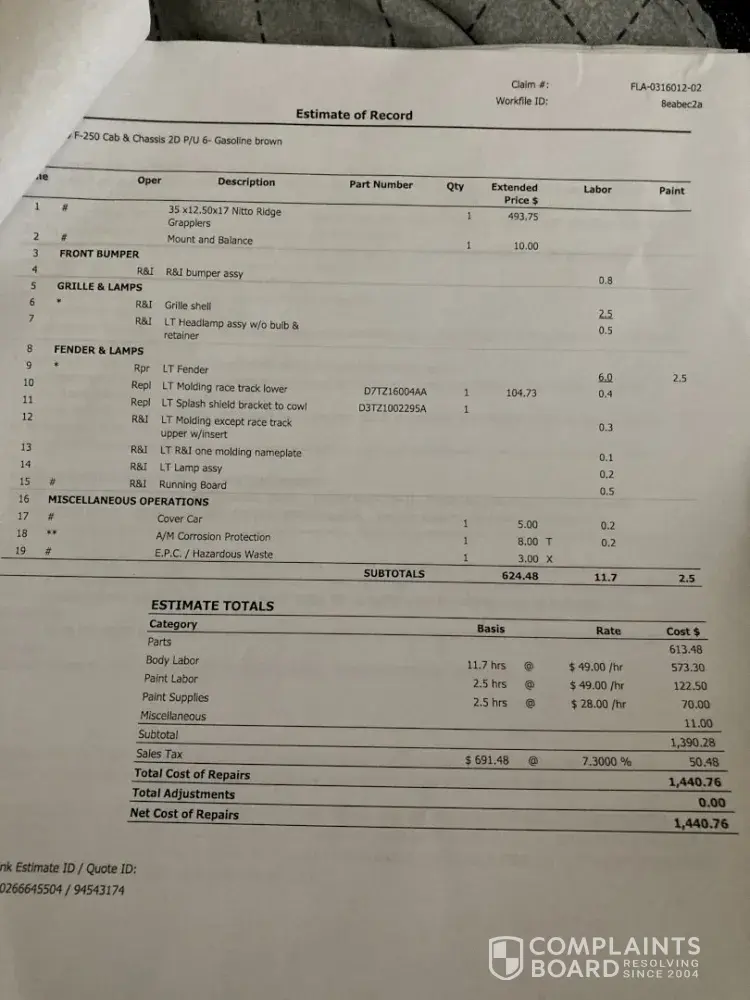 The adjusting agent then filed the investigation paperwork to receive the facts he needed to funded the offenders insurance and either get my car fixed or apply the underinsured insurance coverage I purchase. During the wait for response i performed one of those application estimates and received a paliminary estimate of damage of around 2400.00 or so. As that happened the insurance my agent filed a response of denial because the 2014 Honda Civic that matches the plate my agent sent them was not in a car accident,