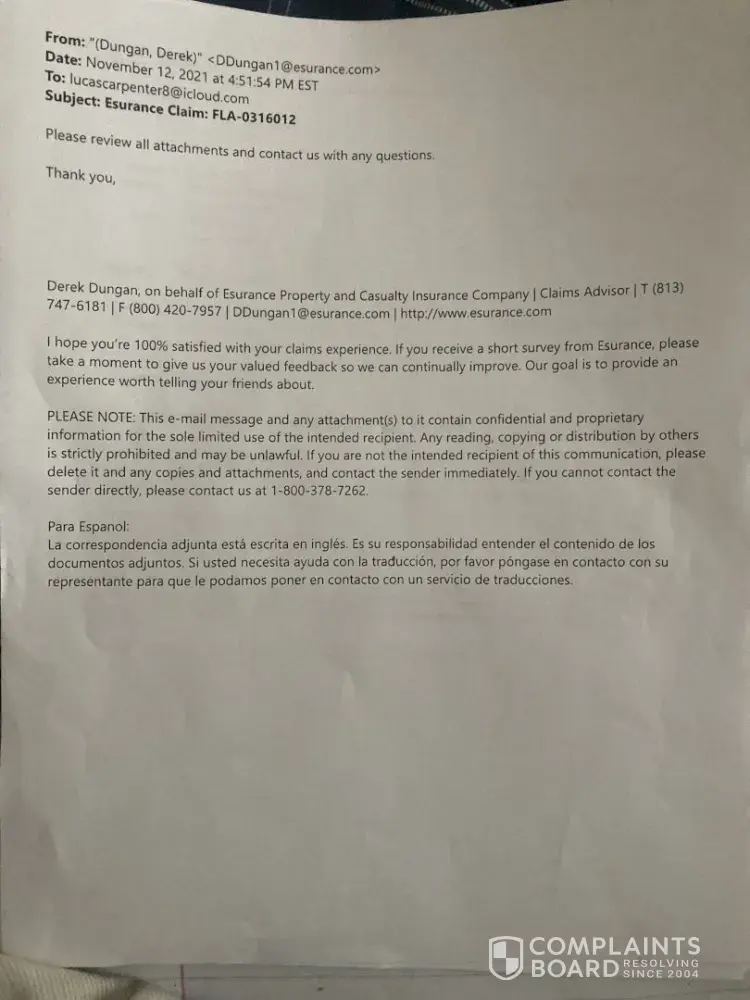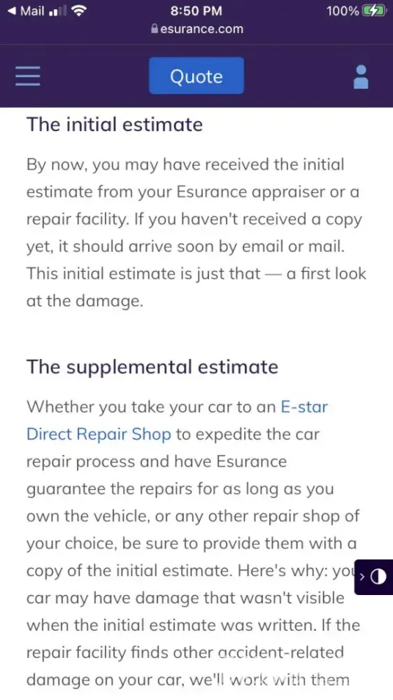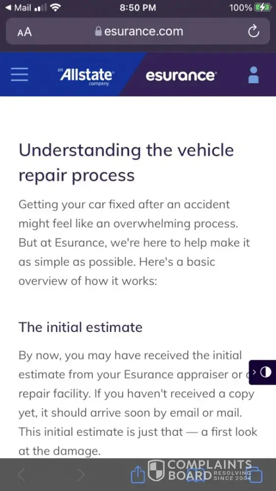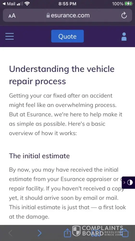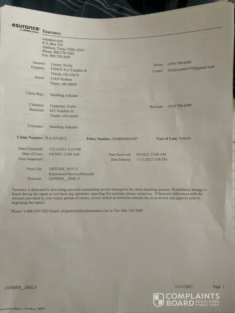 Esurance Claim # [protected]. I had an auto accident on 6/2/2022 and have not had my claim fulfilled. It took 6 weeks for me to hear ANYTHING from the claims adjuster, and to this day (8/17/2022) she has never kept me in the loop with any of the details regarding my claim. She called me the first day I made a formal complaint and she has not returned my phone calls or emails since. Initially, my elusive adjuster (the one and only time we spoke) stated that an appraiser could not be scheduled, so I just need to send her pics of the damage. The next day I am contacted by the supervisor who tells me my quote should be ready within 1-2 days. I was confused because I was told they needed my pics, which I had not sent yet, but apparently, they already had them.