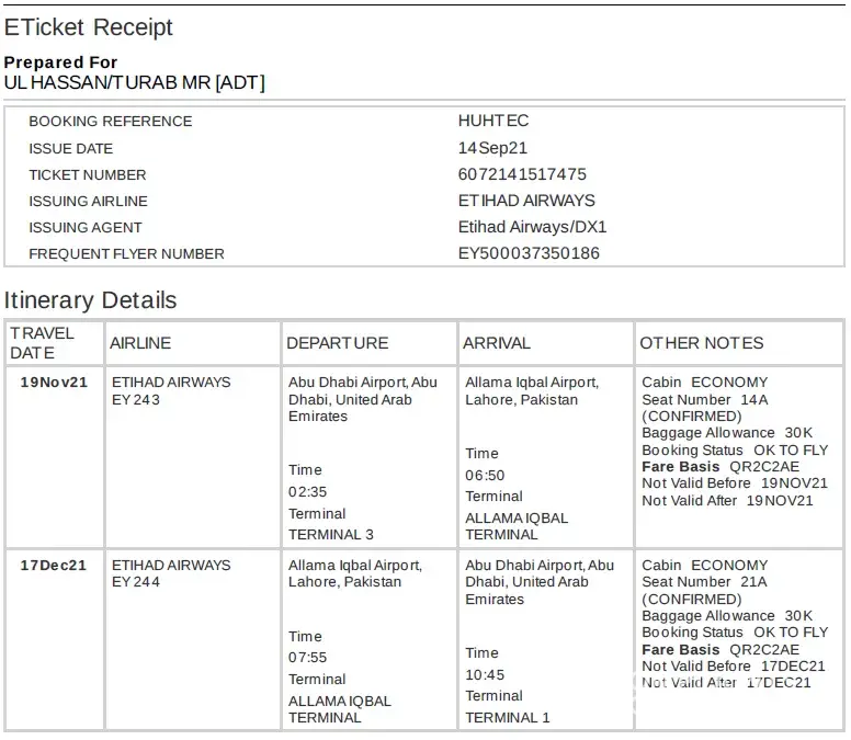 I booked 3 tickets for myself, Wife and Son with Etihad Airways via Flysharp, only to find out Etihad Airways had cancelled our original return journey on 9th November from Islamabad.