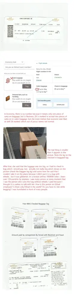 This complaint is with Regards To Blackmail and fraud by Seoul airports Etihad office staff. Before the flight, I checked with the Abu Dhabi call center and checked the information of 40KG checked-in baggage + 2 pieces of carry-on in cabin baggage not exceeding 12 kg each + 1 piece of carry-on in cabin baggage not exceeding 5 kg. At the time of check-in at Incheon International Airport, check-in baggage of 40 kg was completed, but only one piece of carry-on in cabin baggage was recognized, I paid a checked-in baggage fee of 14 kg of the rest. Regarding the information confirmed in advance, he explained in detail to the Etihad Airport officer, but he strongly insisted that the consignment should be unconditional with the incomprehensible and gibberish story. There was no consideration to listen at all regarding the information received from the Abu Dhabi head office call center in advance as well as information which is baggage regulation-related business ticket. This is clearly blackmail and fraud. In front of the other check-in guests, so humiliated and embarrassed, In spite of that, I tried to give a correction. She strongly doesn't listen. In order not to be angry with the crew during the flight to Abu Dhabi, with great stress and embarrassment, humiliated in front of other guests. We need to have a discussion about this with the person in charge of this.