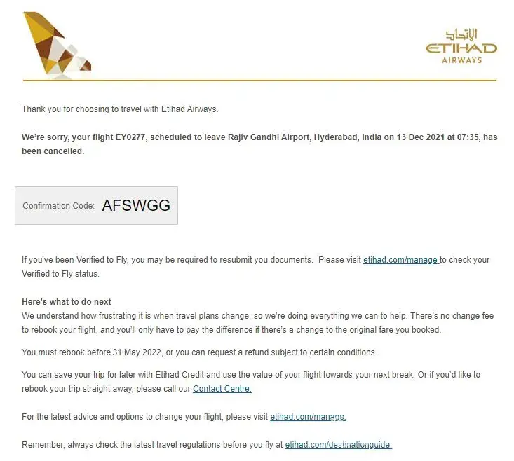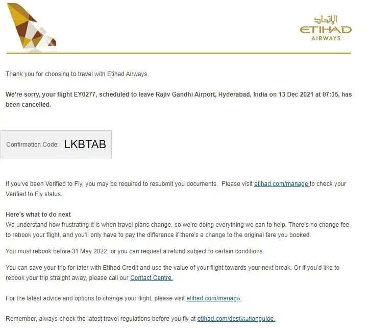 My Etihad flight EY0281 from Kochi to Dubai (XNB via AUH) on Jan 02, 2022 was informed as cancelled on 15th November 2021 without rebooking.