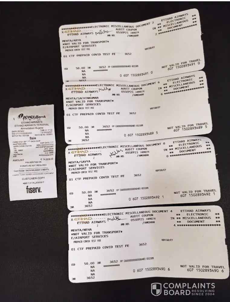I am attaching my ticket, Test reports and also a Receipts of that amount which were taken from us forcefully. And also they didn't do any RCPCR test at Abu Dhabi airport. They only did rapid test, which was actually that time not required/