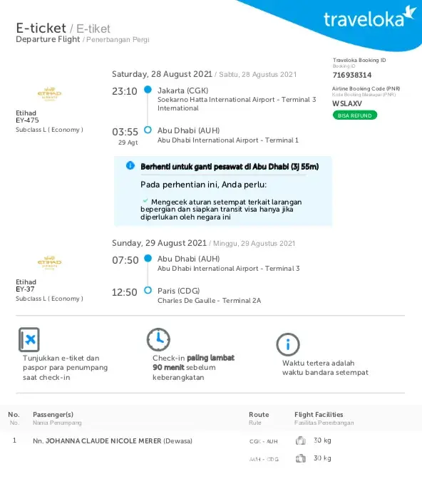 Myself (Johanna Merer - French Citizen - Vaccinated 2 doses of Sinovac) and my partner and fiance (Alex Crees - United Kingdom Citizen - Non-vaccinated) booked flight tickets Jakarta - Paris on August 28th with Etihad.