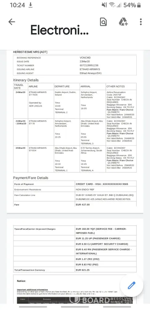 On 24th march 2020, etihad cancelled my flight within hours after booking was confirmed! I am holding a fully refundable ticket, yet I am liable for almost 200 euro cancellation fee - I did not cancel - etihad did! The total lack of support, customer service and communication is absolutely shocking! I have complained on numerous social media platforms and will continue doing so until somebody listens and treats me with respect! The level of arrogance from etihad staff is mind blowing to say the least! I had to rebook on klm and kenya airways to get to sa in time before the travel ban! I have been away from my family since october 2019! I will report this to our national credit regulator as etihad is not exempt from this act! I will further lodge a complaint with the minister of transport office who also released a press statement in this regard today!