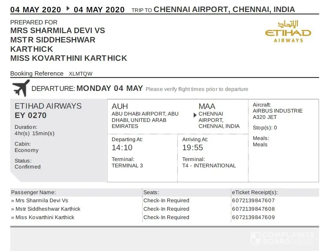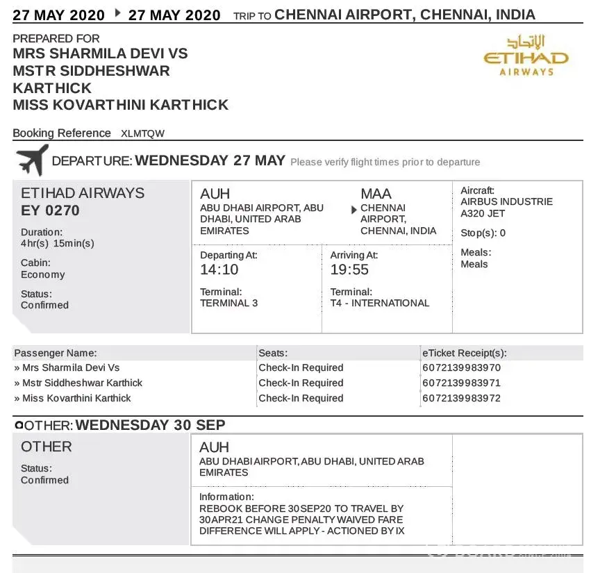 Last 4th march 2020 7:38 pm I booked tickets for my family (one way) in etihad airways (abu dhabi to chennai - ey [protected] aed/person - the total is 1869 aed)