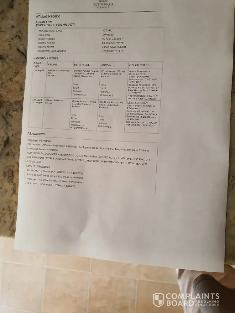 Aug 10 - Notified at Raleigh Durham Airport by American Airlines that Etihad had cancelled my American Domestic and Etihad international flight.