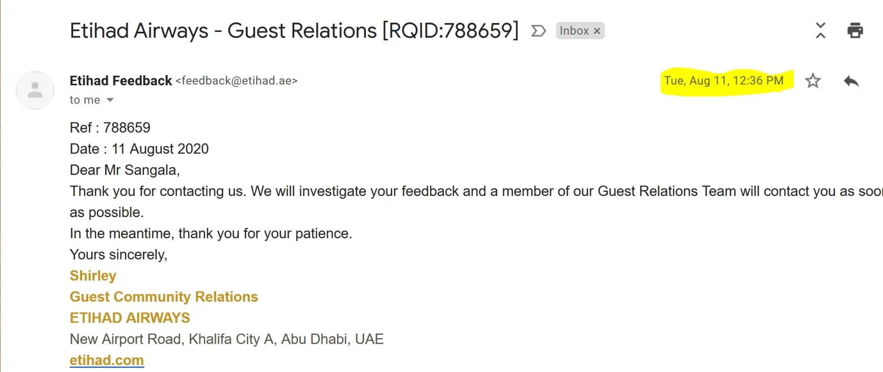 3. By Email - I have written emails to Etihad, including the emails to the CEO of Etihad Airways, but there is no response to my emails.
