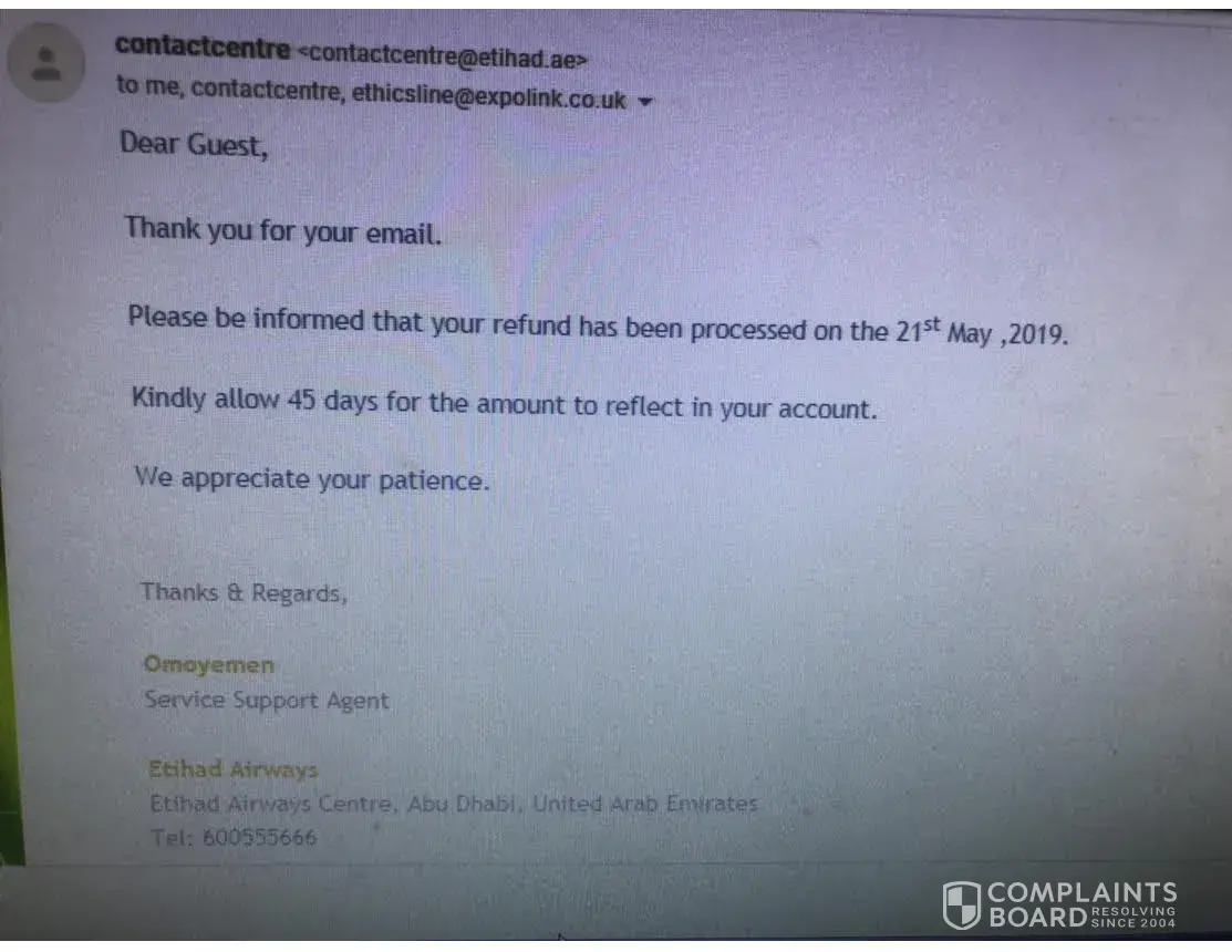 I was advised 'guest@etihadguest.com' to send an email to 'contactcentre@ethiad.ae' but the email 'contactcentre@ethiad.ae' is not reachable .Please see below request.