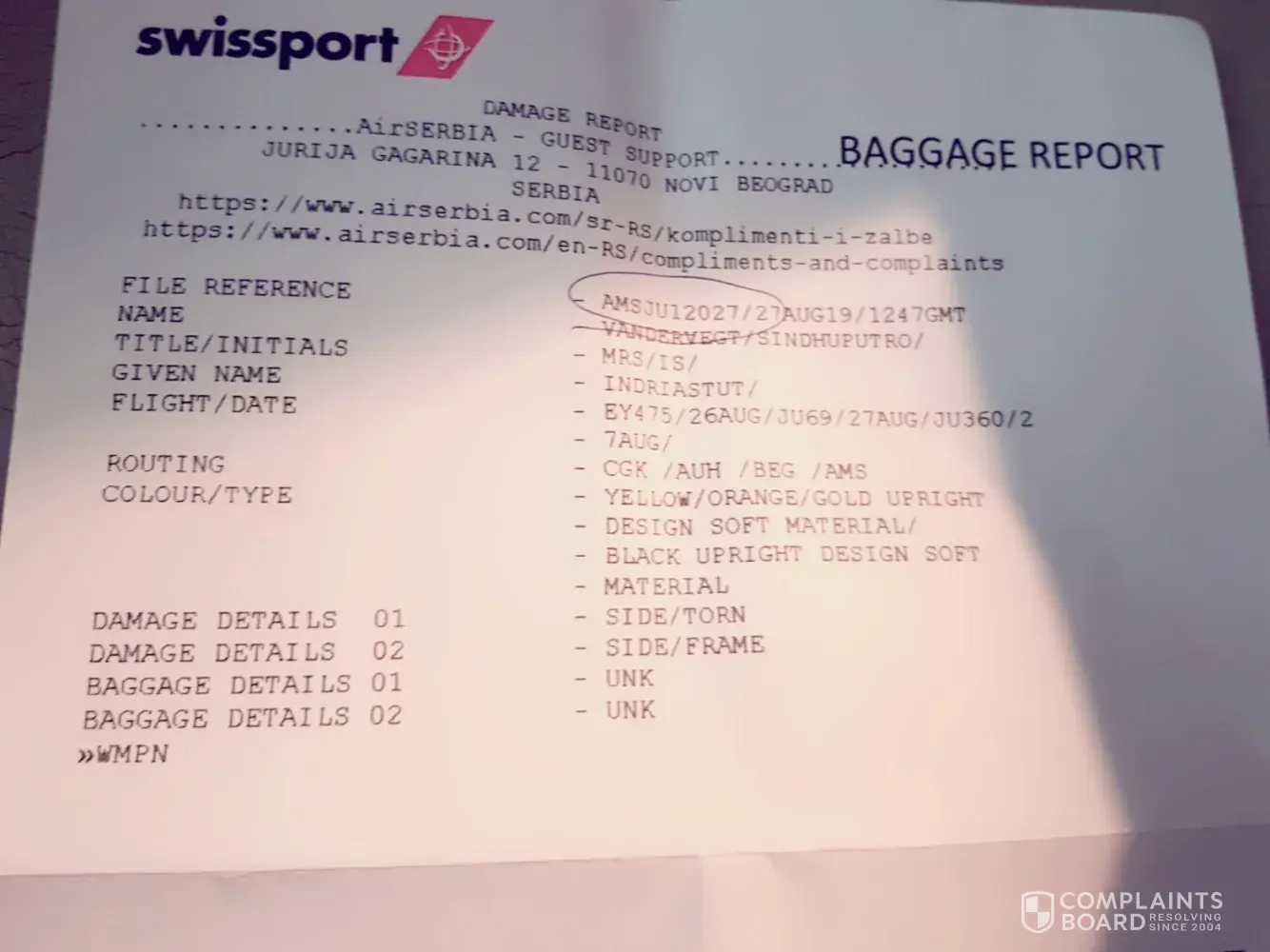 And the other reference number when our 2 luggages didnt arrive, reference number is: AMSJU12026/27AUG19/0843GMT