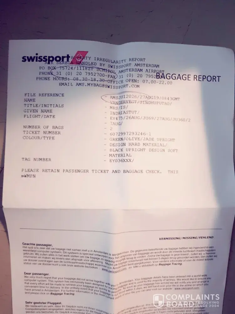 When we arrived at Schiphol, we directly put our complaints regarding to our damaged luggages. Reference number: AMSJU12027/27AUG19/1247GMT
