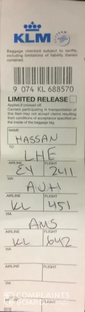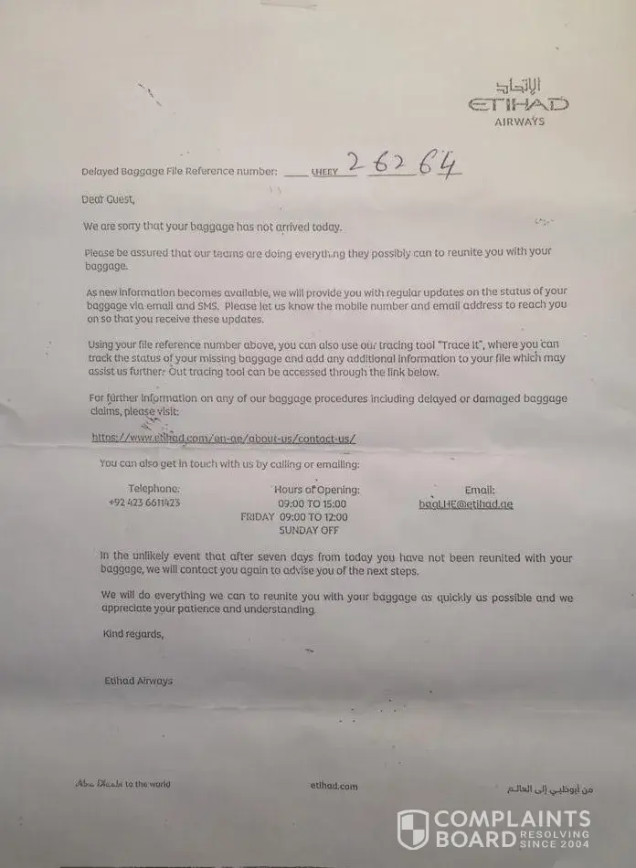 Due to irresponsible conduct of that lady at the Etihad boarding counter I did not receive my luggage on arrival in Lahore. I had to wait and finally lodge a report. Go through mental agony for two days My luggage arrived on Sept 19, 2019.