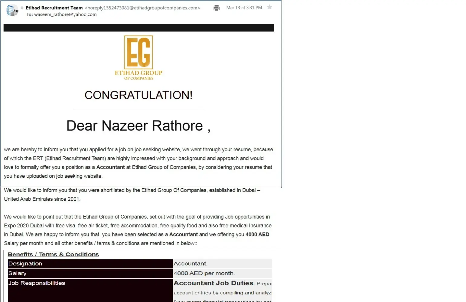 I received a job offer from etihad group of companies, for the post of Accountant, they are offering me 4000 AED. With all facilities provided by company.. They demanded me passport copy and photos to upload on their website for the further process.. Kindly tell me is it fake or real... I received email and also about job offer by etihad group of companies. And I received email from ert@etihadgroupcareer.com.