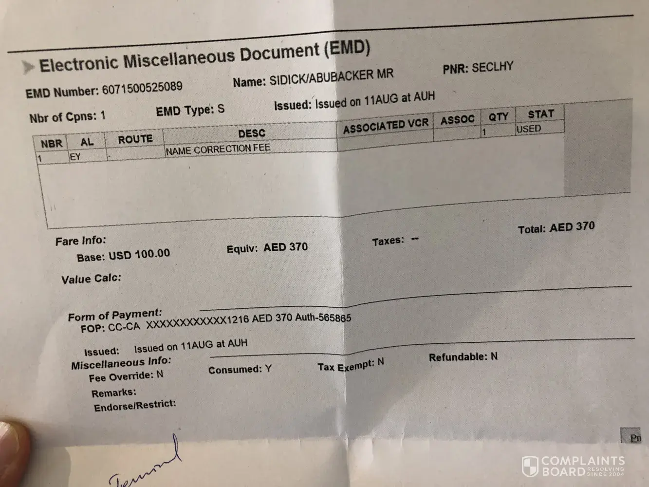 ticket reissued because no family name in issued ticket