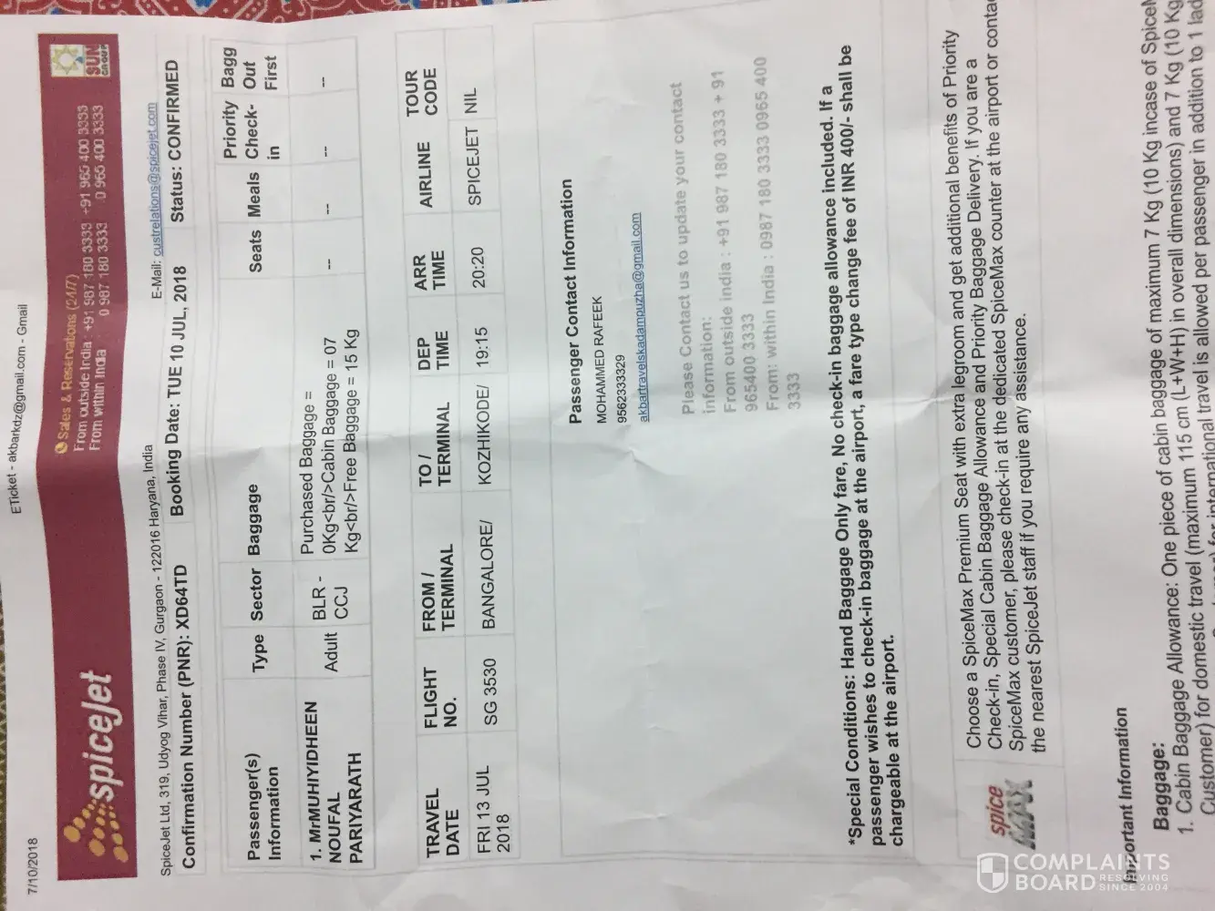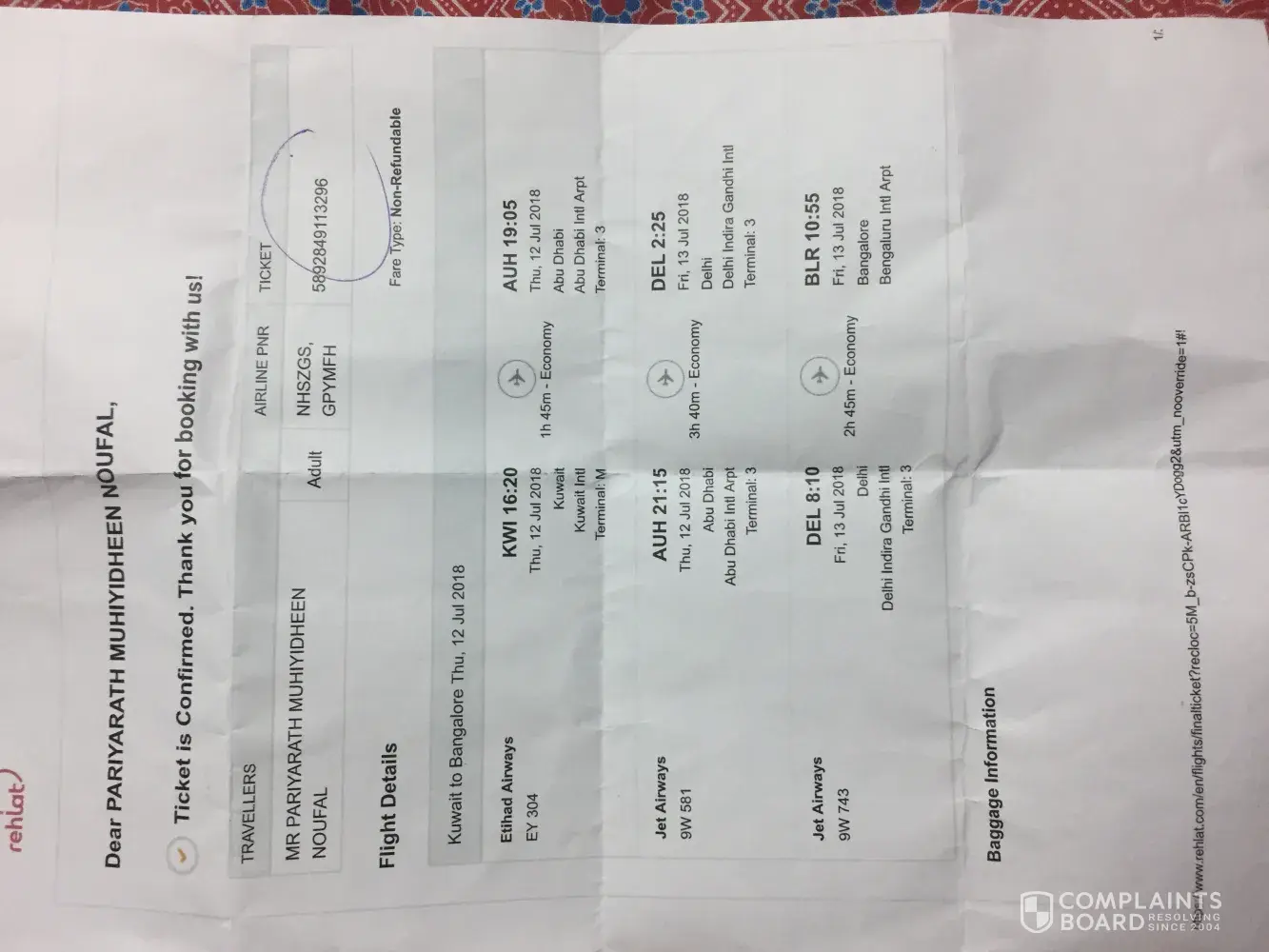 I am traveller from Kuwait to Banglore, Ticket no:[protected] on 12/July/2018.