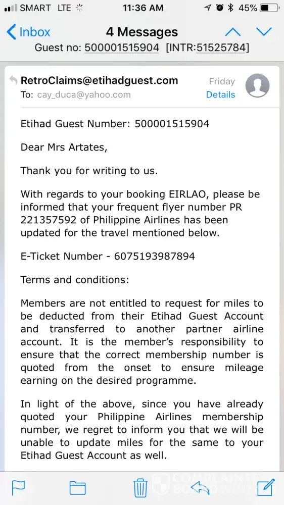 I understand if the latest set of flights back to manila is not credit but for the earlier sets of flights it should not be the case. Ive emailed them and they claim that the miles is already updated and credited to my account but neither my pal (which they claim where it is credited) nor my etihad membership is updated.