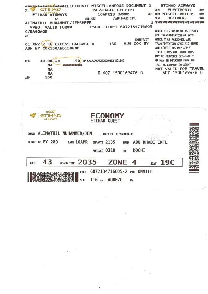 My self Jemsheer Alimathil Muhammed Basheer and my frequent flyer no: [protected]. Please be noted an additional baggage charge (AED: 150) has been deducted from my credit card for 1.1 kg additional baggage. As I understood this charge is for additional 2 kg. So, may I request here to return half charge AED: 75. Please find related documents (Attached photos: Ticket, Actual Weight in Airport, Receipt & Boarding Pass and Etihad Guest Card)