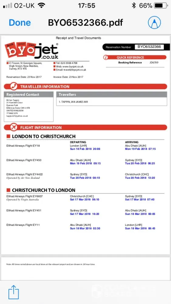 Whilst organising my return to the UK my sister searched for later flights from Christchurch to Sydney as we would need to leave about 0300 in the morning for my flight. My sister did find two later flights (which I would have had to pay extra for)that would have meant I could have spent more time with my family and my new nephew who was 11 months old and I hadn't met before and I would have had a shorter lay over in Sydney. I flew back on 17/03/2018.