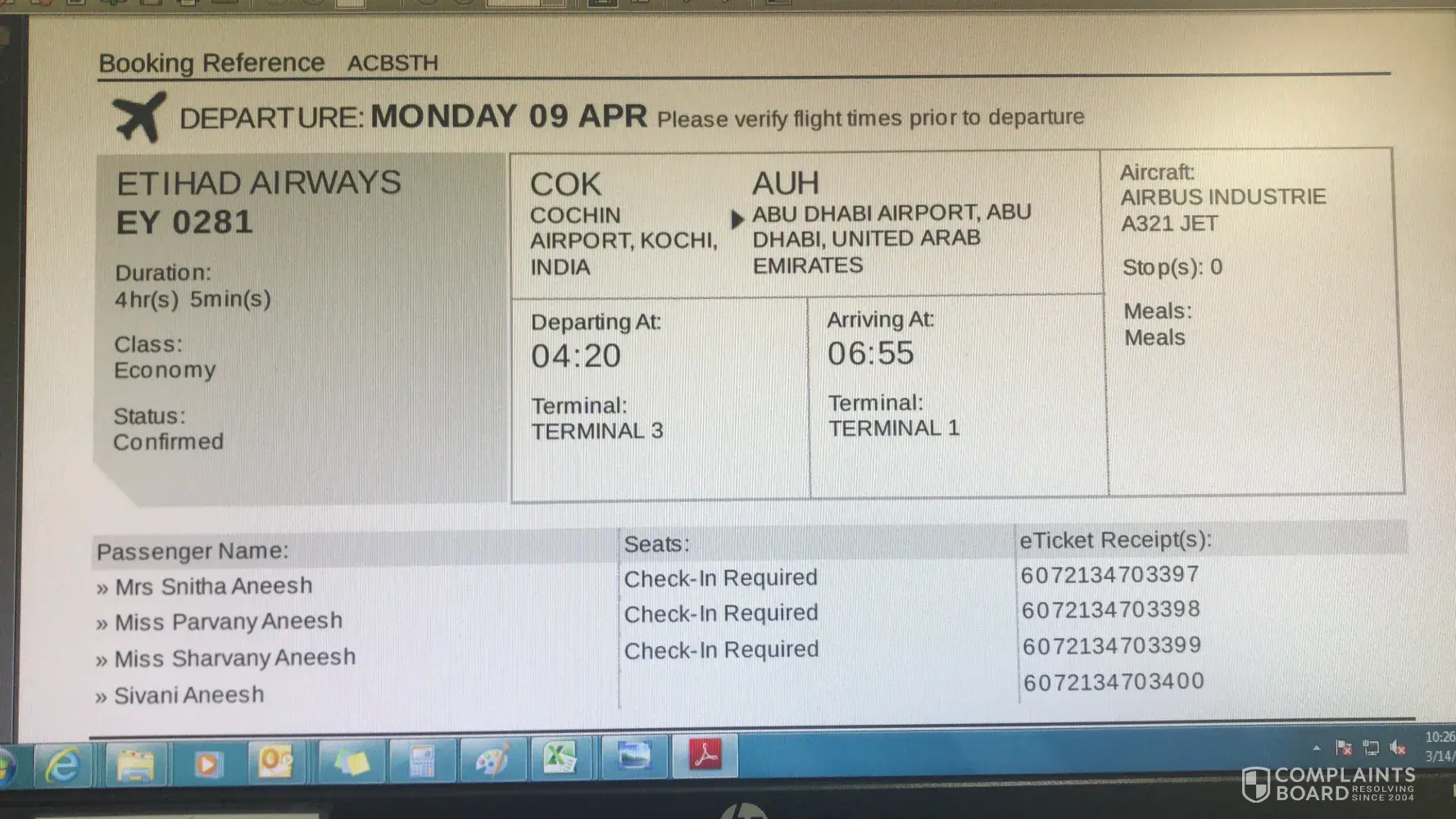 My self ashok, booked flight ticket from Bahrain to Bangalore for my parents and child on 01st April 2018 through my credit card (ticket attached), we were there in the bairport 4hours before the departure, while check in etihad officers not allowed us to travel becouse of in my parents passport doesn't shown sir name in which while I mentioned sir name as per my son (child) passport, requested to etihad officers and spoke to customer care around 1 hour, nobody help to solve the issue, and demanded BD.300 for cancellation of existing tickets and reissue of new tickets, I thought that all officers and customers care played with me to simply to delay with asking documents through mail and so on. I was very upset with the response I got.