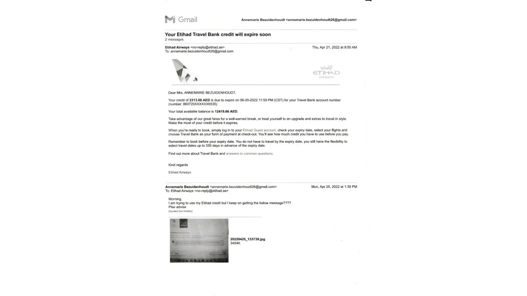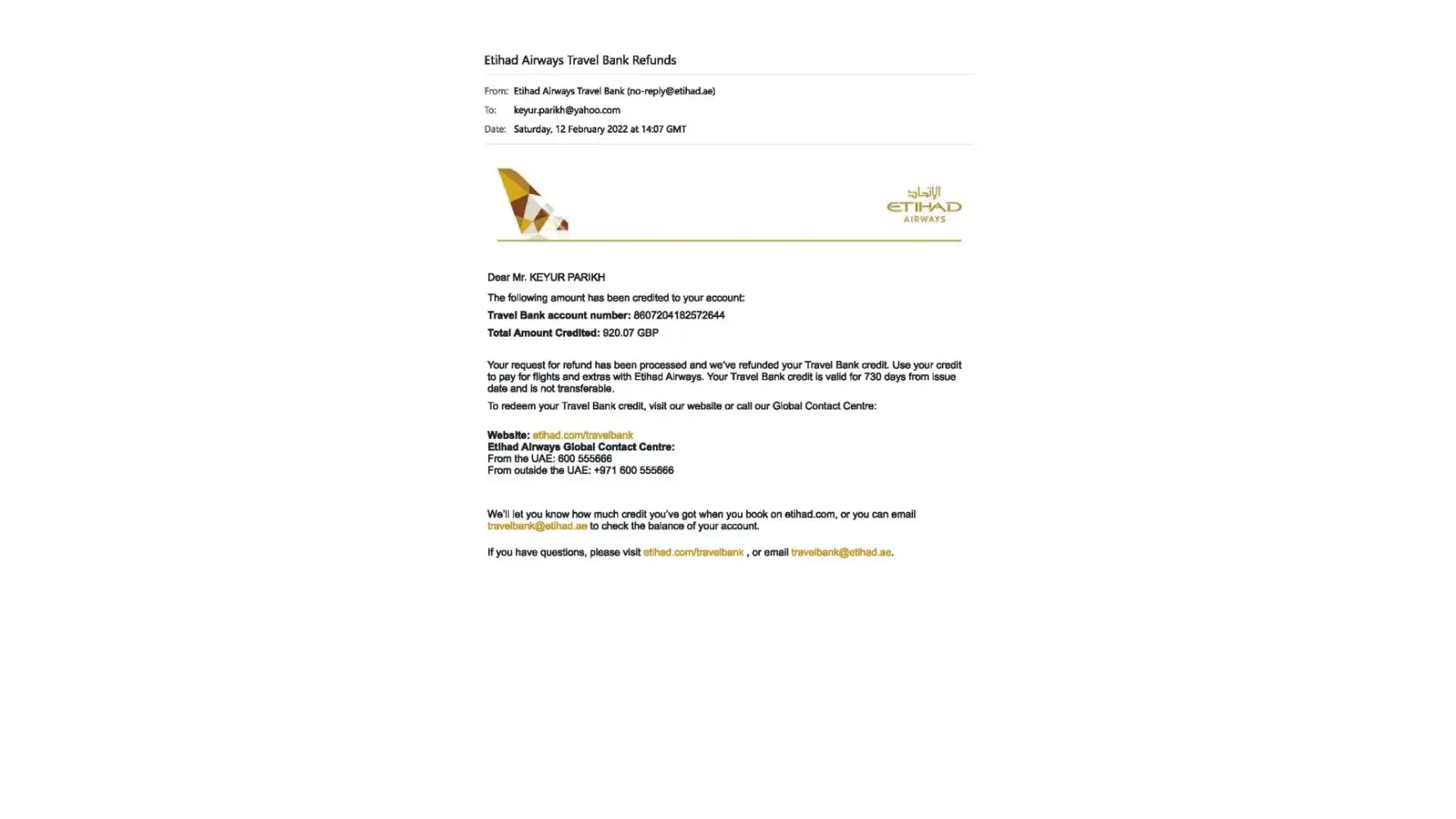 2) Travel credit refund confirmation email from etihad