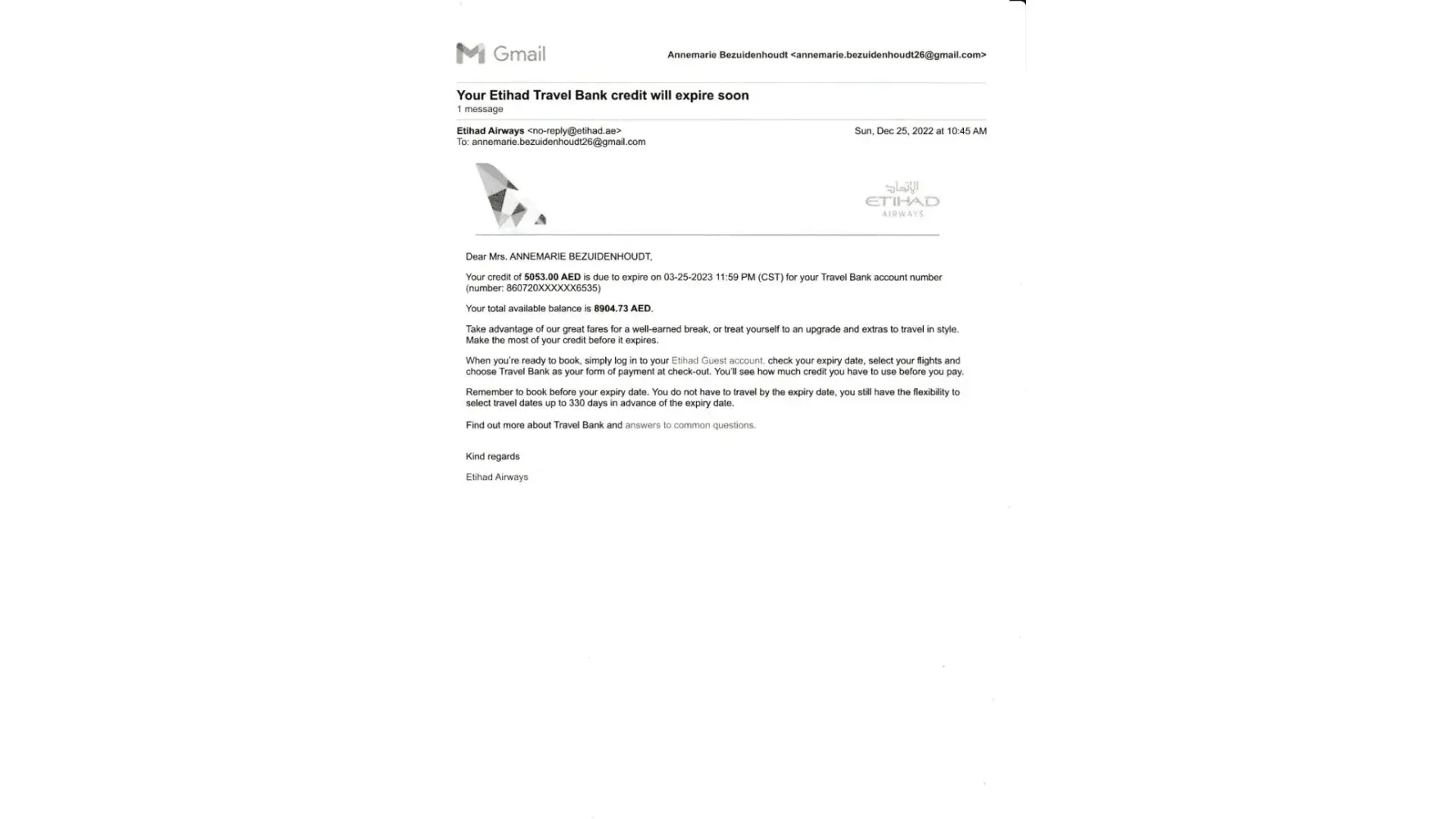 I feel strongly that I should have received an email same as the other to confirm to me when the last monies will fall due or will expire and that has not been done, because clearly the email of the 25th December only refers to 5053 AED will expire on the 25th March 2023 and nothing about the rest that is still outstanding. I am a resident in Abu Dhabi