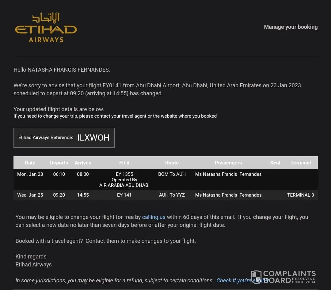 4) Complaint registered with Etihad,