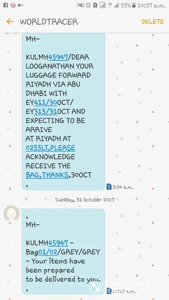 My baggage was sent via Ey 411 30th October from KLIA to Abu Dhabi then transit to Riyadh via Ey 315 31st October. I got message said it's ready for collection yet when I reached they only give me one luggage. But based on the message my both luggage is ready for collection.