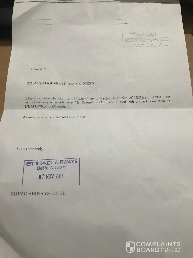 I travelled with Etihad on flight EY 020 from London to Abu Dhabi on 06/11/2017 and EY 228 from Abu Dhabi to New Delhi on 07/11/2017. I supposed to reach New Delhi at 07.55 am.