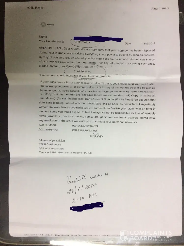 We raised a complaint about baggage loss with Etihad Airways. The complaint no is “CDGEY30224†and I have attached the copy of it.