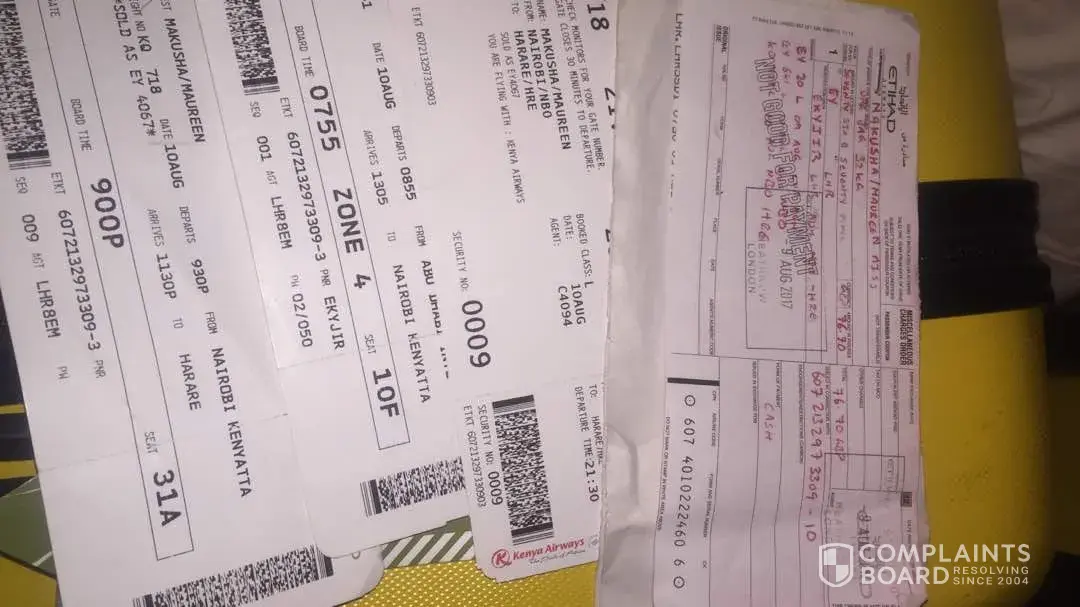 I travelled on etihad airways under ref numner ekyjir.. Lhr-abh-nbo-hre. On the 9th of august. On arrival to zimbabwe on the 11th of august as the baggage came out I noticed my bag was severely damaged. I informed the security guy at immigration who told me to go to nhs, it was late around midnight when we went there noone responded. I then called the airport the next day to speak to kenya airways officials regarding flight number kq718 and they informed me that it was a connecting flight and the best I could do is to call etihad before the week ends im in zimbabwe so I had no direct office to call here. I advised my sister in law to call them, after several attempts to file the complaint online. I got hold of a colleague who works at air zimbabwe and he advised me to call etihad, I recalled today and they told me if I dont have a ref number I should file a complaint directly. I bought my bags on the 8th of august, brand new from travel gear. Im a flight attendant and I respect airport laws. I even paid for extra luggage so obviously my bag was worth taking caution of as I even paid extra to have my bags upgraded to 32kgs. Im heart broken at the carelessness the handlers took on my bag. And my bag was brand new and it cost me over 100 gb. I would like acompensation for mishandling of my bag. I will insert all pictures of my bags state, I live 3 hours away from the airport, and it just did not make sense to carry back a brocken bag. I assume my bag must have been thrown evidence by the deep crack and the scratches on it. Iv never had a problem like this before.. Please advise what I must do.. I need a bag replacement. Maureen makusha