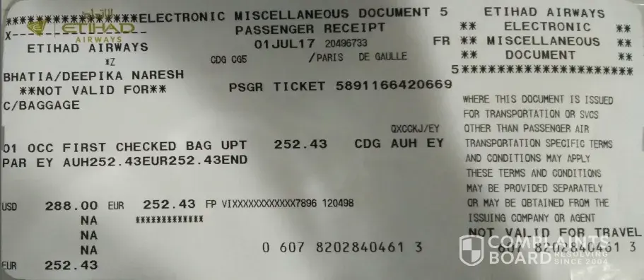 Attached document: Receipt of amount paid for extra baggage