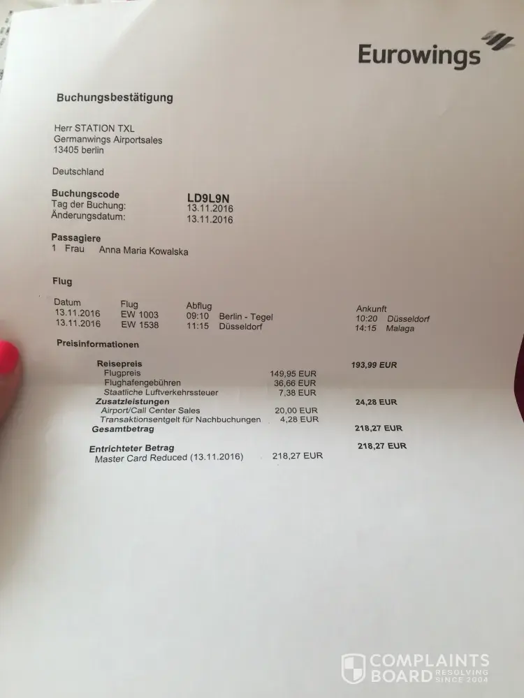 My flight from abu dhabi to berlin, number ab7495 has been canceled. For this reason I did not get on the next flight from berlin to malaga (Ryanair, flight number fr2590). I had to buy new ticket if I wanted back to spain where I live now (Eurowings, flight number ew1003 and ew1538). I expect reimbursement of the ticket and compensation for loss of flight for which I paid much earlier. My e-mail adress: kowalska. [protected]@gmail.com