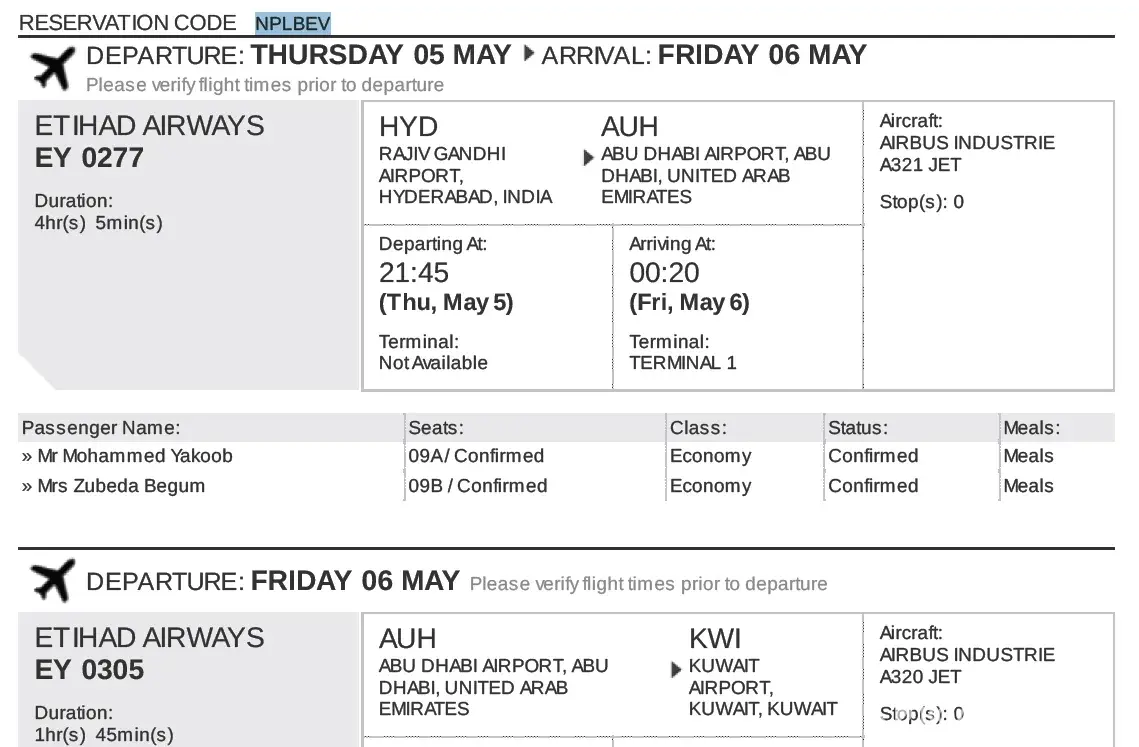 The same thing happened for my return journey also.Return journey was more difficult. I traveled with my 1.5 years daughter.When I came for boarding in Cochin, they told daughters ticket was not confirmed for journey.So I waited boarding pass section for one hour & finally it cleared. The flight delayed for 1 hour, next will be the same happened before.Around 7 hours I waited in Gate no:35 in Abudabi Airport.Baby was too tired.