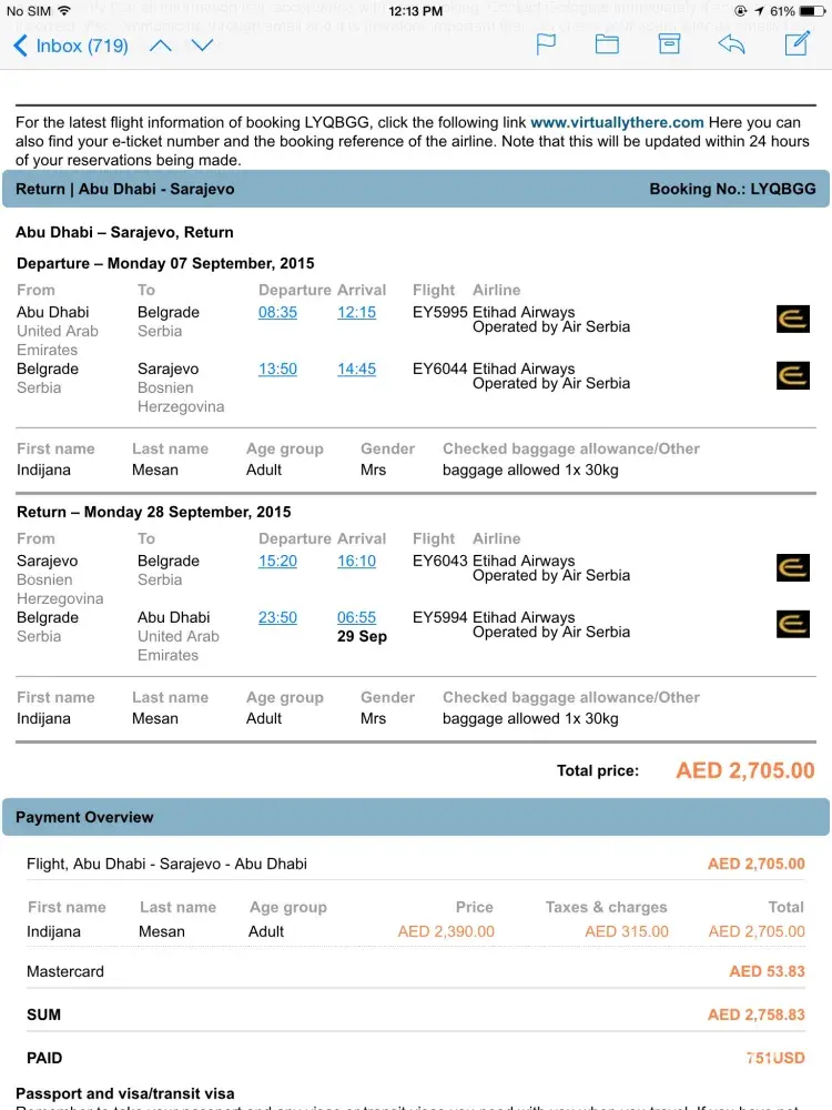 I bought Etihad ticket through sky scanner aplication (Dubai- Sarajevo). It was clearly marked "E" (Etihad logo) and written down Etihad Airways. After I entered my credit card information and paid the total amount 2700 + 150 AED, I received an email with ticket itinerrary. So, after I bought Etihad ticket it was written: Etihad operated by Air Serbia! I went to your office in Emirates Mall the day after, they confirmed the flight is operated by AirSerbia. I tried to change ticket, but there were no seats left with Etihad. Lady who worked on Etihad counter didn't or couldn't give me any explanation why did I buy Etihad ticket and then got an Air Serbia ticket. The service on flight was terrible, obviously low costing flight, which I paid 2700 AED!( certainly the price wasn't low cost as flight!) And in Serbia, Air Serbia crew made a big deal because I carried 30kg. They shout at me that it is not possible to carry more than 23 kg. I've tried to explain that it is clearly written on my ticket that I bought etihad ticket with 30kg baggage allowence. They said they don't care about it, Air Serbia has it own policy! I have never met that rude crew! They threated me like they gave me a ticket as a mercy or something, they certainly didn't threat me as a customer! Even low cost air companies such as Fly Dubai has much much much more professional stuff! I travel a lot by an airplane and this is my first compliant! What made me furious was my totally damaged baggage on arrival in Abu Dhabi! The bag is brand new, it had it's first flight to Sarajevo, and on it return you managed to destroy it! The bag is Victorinox brand, which is great and very expensive brand too. I can not understand how did you manage to destroy it, since my other Victorinox bag is 4 years old and in great condition! After I figure out my bag is damaged, I went to Etihad baggage service! The Etihad officer made a report and told me that they will contact me within 48 hours and they will other fix my bag or replace it with new one. I said fine, I really trusted that officer. (For some reason I thought Etihad stuff is great) I landed to Abu Dhabi on 29th September and today is 4th October! Nobody called me for 5 days! I trully hope you will have a sense for my problem and try to solve it as soon as possible. I really paid too much money (2700 dirhams, I repeat) for this terrible flight! What I can not forgive you is my brand new bag! I really demand the same bag as mine or the exact amount of money for my Victorinox bag. And Honeslty, I hope you have some reasonable explanation why are you selling Air Serbia ticket (awfullll company) as an Etihad Airways ticket. It is not transparent nor ethical. My flight information are as follow: Indijana Mesan, Ms Reservation number: JRFDMY Flight: 5411 and 6043 economy Damage report: FILE REFERENCE: AUHJU10369/29 September/ 0425GMT NAME: Mesan/Indijana TITLE/INITIALS: IM FLIGHT/ DATE: JU800/ 28 September ROUTING: BEG/ AUH COLOUR/ TYPE: RD22RHW