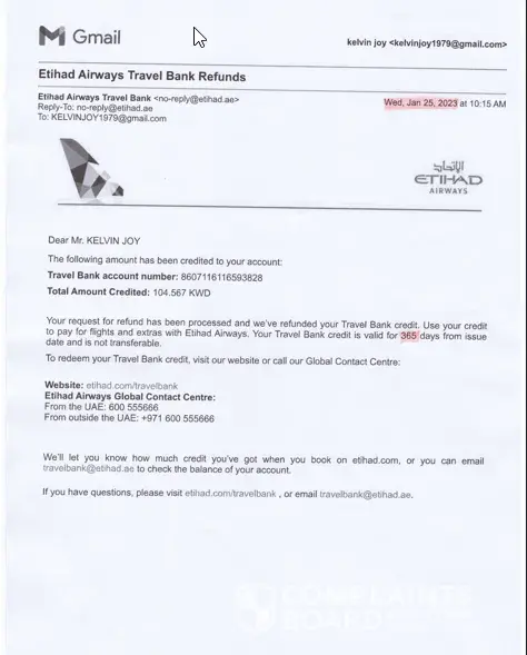 Here is the refund confirmation from the support person at Etihad Airways who provided a confirmation for my refund request...