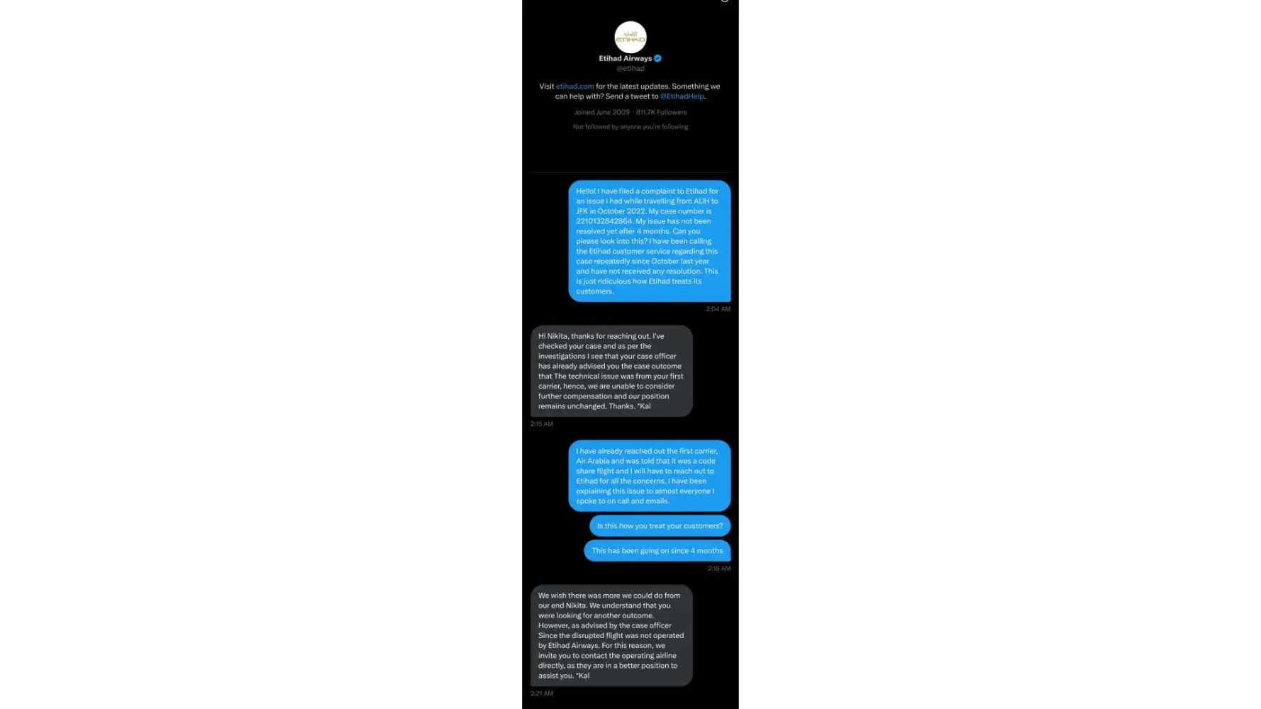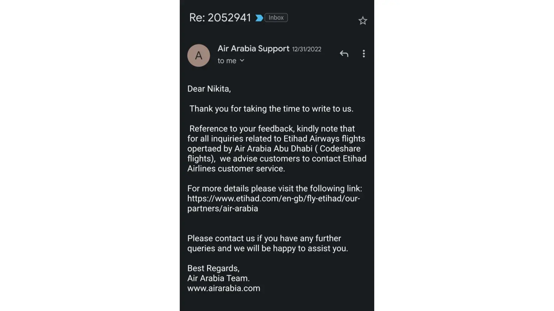 Hello, I had a flight on 10/08/22 from Mumbai, India (BOM) to JFK with a layover at Abu Dhabi (AUH). The first itinerary of the flight (BOM to AUH) was with Air Arabia and the second part of the itinerary from AUH to JFK was with Etihad Airways. When I went to Mumbai airport on 10/08/22, I was given a boarding pass for only BOM to AUH flight and not for AUH to JFK flight. I was told by the Air Arabia representative at the check-in desk that I can collect the boarding pass for my AUH to JFK trip when I reach Abu Dhabi. I had a layover of 1 hour and 40 minutes at Abu Dhabi airport. When I reached AUH, I went to the Transfer Desk of Etihad Airways at Terminal 1 and was told by the Etihad representative that they cannot issue me a boarding pass for my AUH to JFK flight. They asked me to contact the customer service repeatedly and informed me that there was some technical issue in their system and they cannot provide me with the boarding pass. I had my boyfriend also calling customer service multiple times just to be told that they cannot help. After almost 4 hours of waiting at the transfer desk, they finally booked me on a different flight which was going to fly at the same time on the next day 10/09/22. I asked them if they could provide me with some kind of accommodation and food vouchers/coupons that I can use during my stay at Abu Dhabi airport, but they refused to provide anything. The representative present at the transfer desk asked me to talk to his manager who was present at a different desk instead of calling her and speaking to her. I went to the location where he said the transfer desk for Etihad Airways but could not find it. Finally, I booked a hotel named "Abu Dhabi Airport Hotel" which was located right next to the Transfer Desk at Terminal 1. I stayed there for 18 hours (12 pm on 10/08/22 to 6 am 10/09/22) and the total hotel charges came to 328.94$ and food which cost me 15.63$, with a total expense of 344.57$. I submitted this complaint to Etihad Airways (Case Reference No. [protected]) on 10/12/22 asking for reimbursement for the amount that I spent at Abu Dhabi airport but haven't received any resolution from Etihad Airways. After repeatedly calling Etihad Airways, the Guest Relations representative named Rhizlan finally sent me an email on 12/05/22 stating that "The technical issue was with Air Arabia" and asked me to contact Air Arabia to address my concerns. I contacted Air Arabia (Case Number 2052941) and they reached out to me saying "For all inquiries related to Etihad Airways flights operated by Air Arabia Abu Dhabi (Codeshare Flights), we advise customers to contact Etihad Airlines customer service". I have been repeatedly calling Etihad Airlines customer service since October 2022 to get updates on case #[protected] that I submitted to Etihad in October 2022, but my case has still not been resolved.
