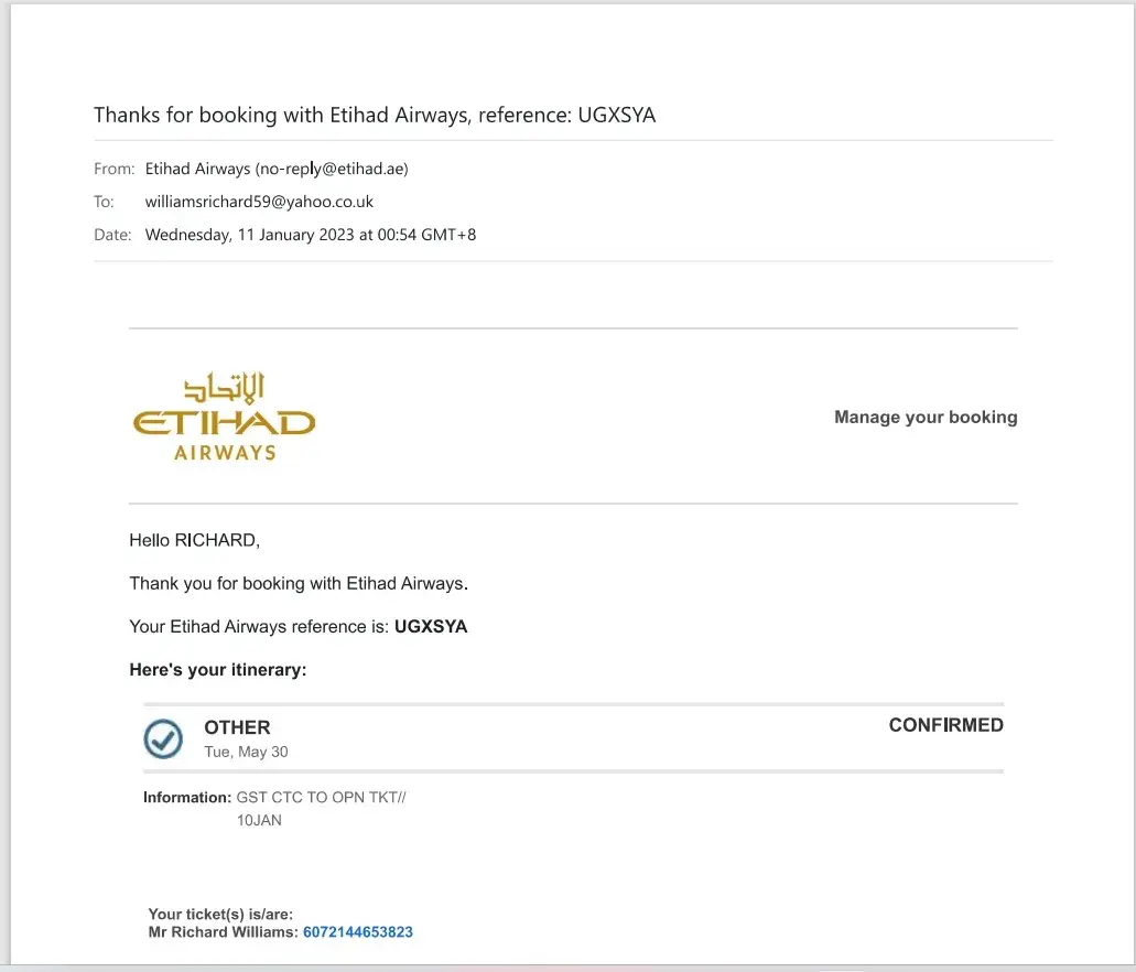 My husband, Douglas Warner Pasea, booked return tickets for himself and me, Christchurch / London return, via Abu Dhabi, departing Christchurch on 27 July, 2022, and leaving London to return to Christchurch on 19 January, 2023. The booking reference was DZJVBL, issue date, 16 Jun 22 and his ticket number was [protected].