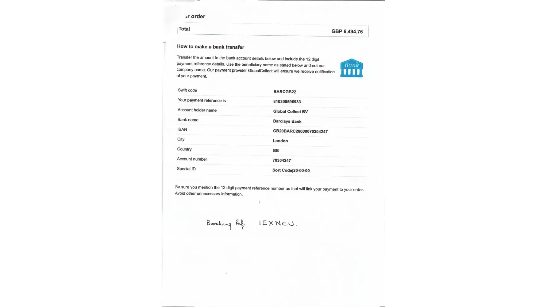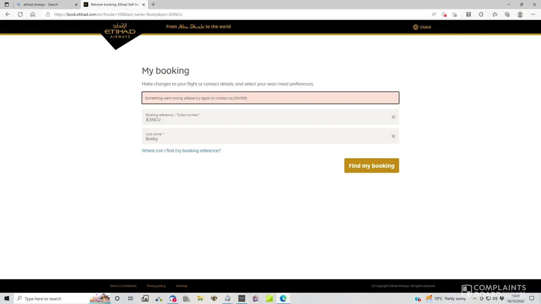 Next I tried direct bank transfer to Global Collect BV (payment reference [protected]) which Etihad accepted and I received confirmation of the booking with a 'Booking reference number IEXNCU (I have attached a copy). The money left my account at 16.30 on the same day (see screensaver of my account page). Since then I have not received any correspondence, emails etc. When I attempt to manage by booking on the Etihad website by using IEXNCU, I get a message that reads 'Something went wrong' (see screen saver). I have checked with my bank manager and the money has not returned to my account so it is somewhere in Etihad.