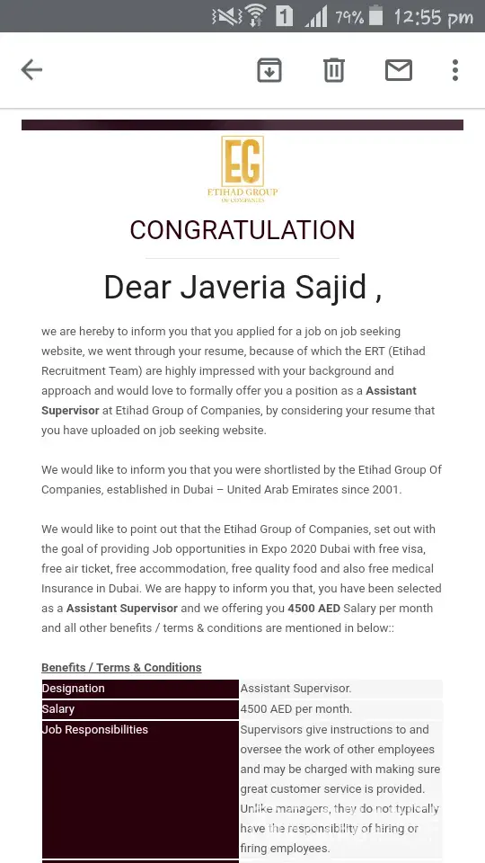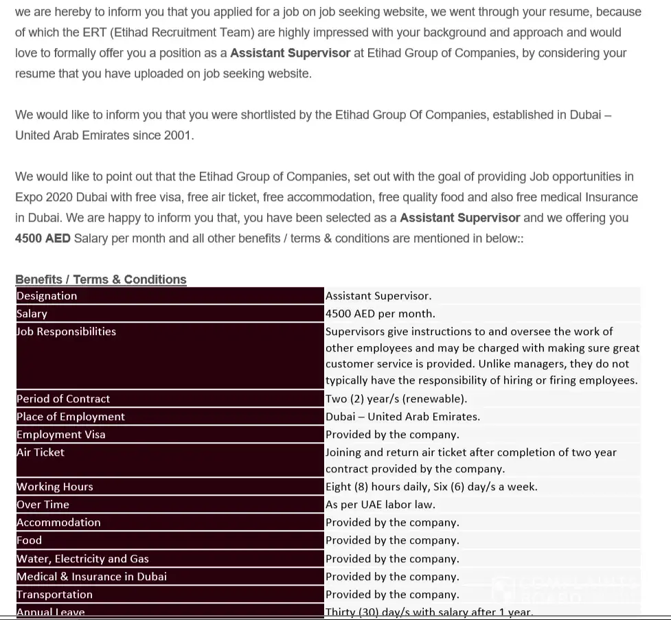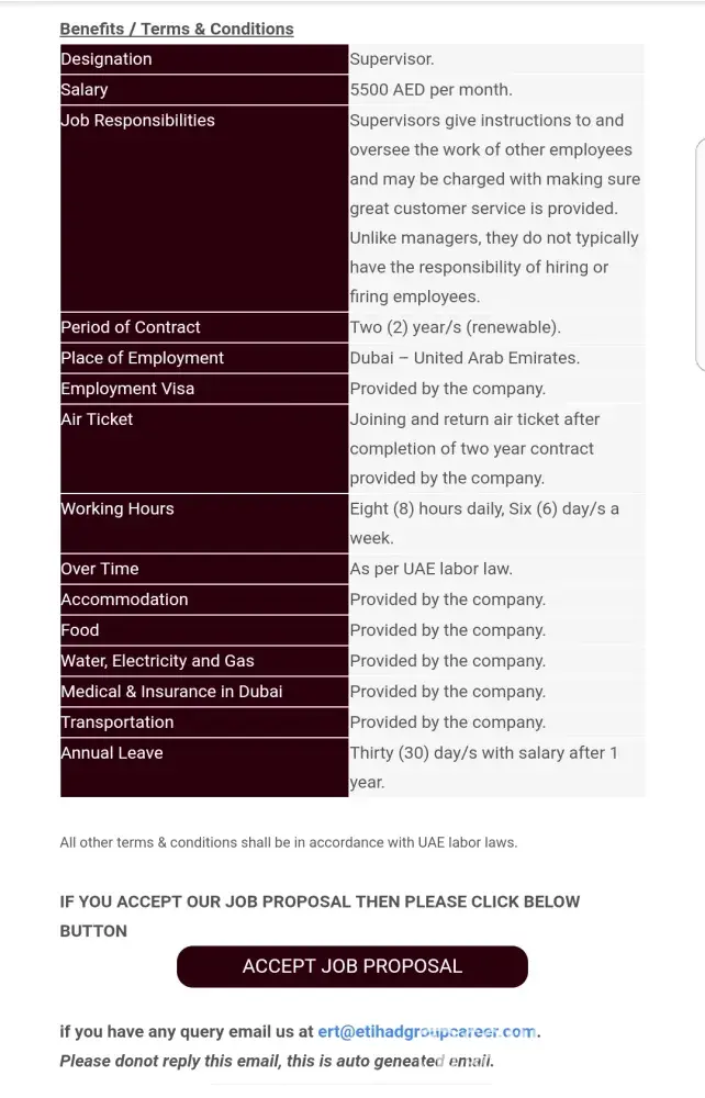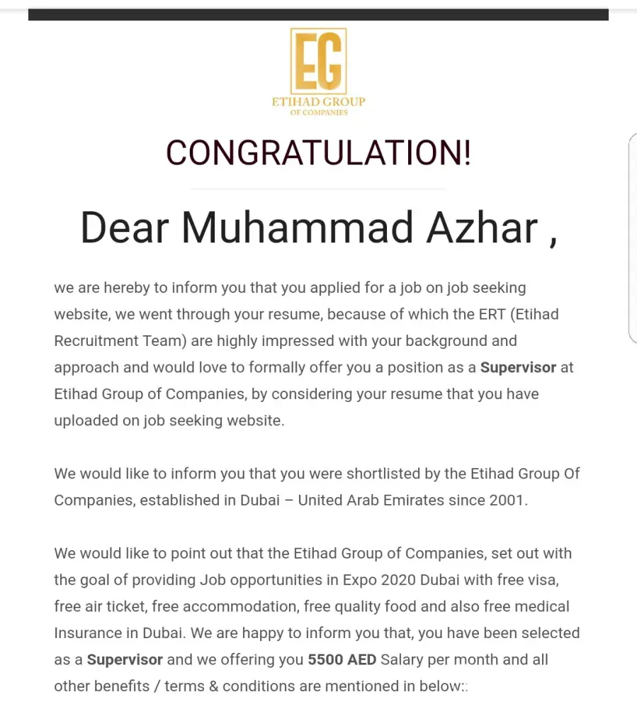 I received a job offer from Etihad Group Of Companies, for the post of Supervisor and they are offering me 5500 AED. With all facilities (free visa, free air ticket, free accommodation, free quality food and also free medical Insurance in Dubai.) provided by company.