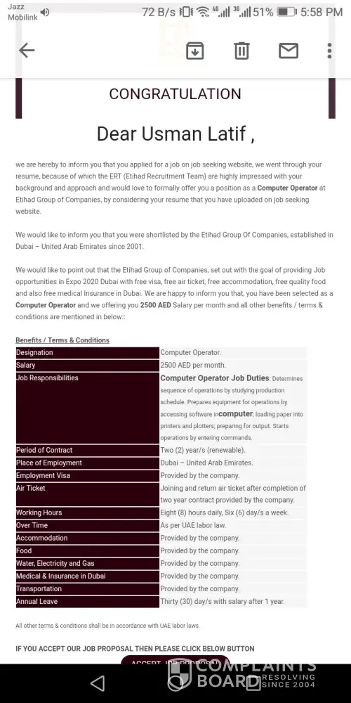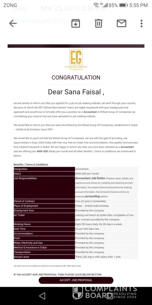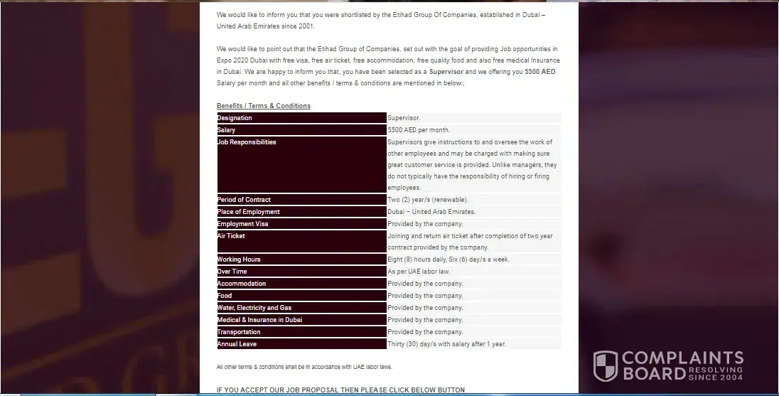 I received a job offer for the post of "ACCOUNTANT". Although I applied for this job but the way I received there email and SMS to my cell number, is causing doubts. I also browsed the internet there were various complains about similar fake job offer by Etihad Group of Companies. I also attached the pictures of there offer and requirements.